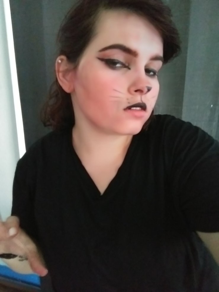 This is the most basic Halloween Makeup ever, but I like it. Everyone loves being a black cat for Halloween. It is so easy to do too. I just did wing eyeliner and also did a wing in the tear tucks. Then I just made a nose and whiskers. I think the part that really helps, is just coloring the top lip black and not the bottom. Also I had a hard time taking off all of the red makeup and there was still a red tent to my face afterwards.