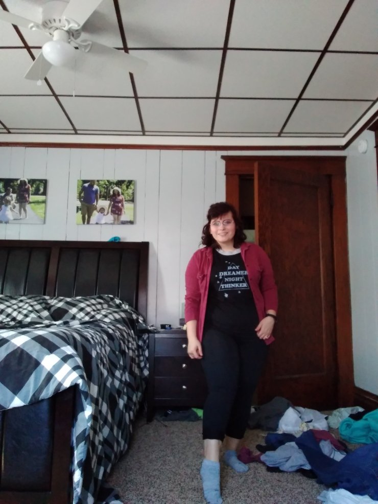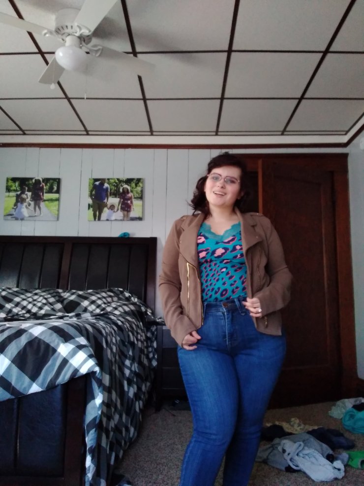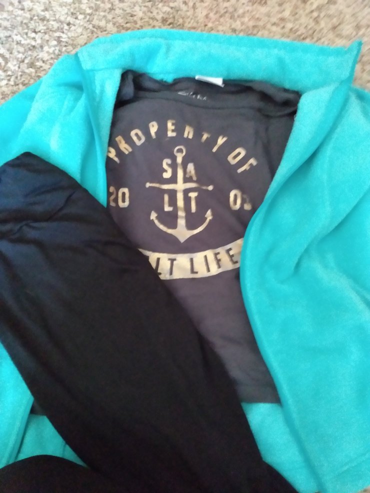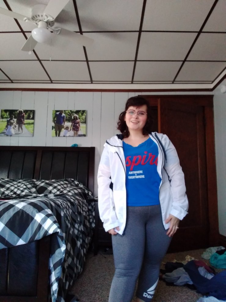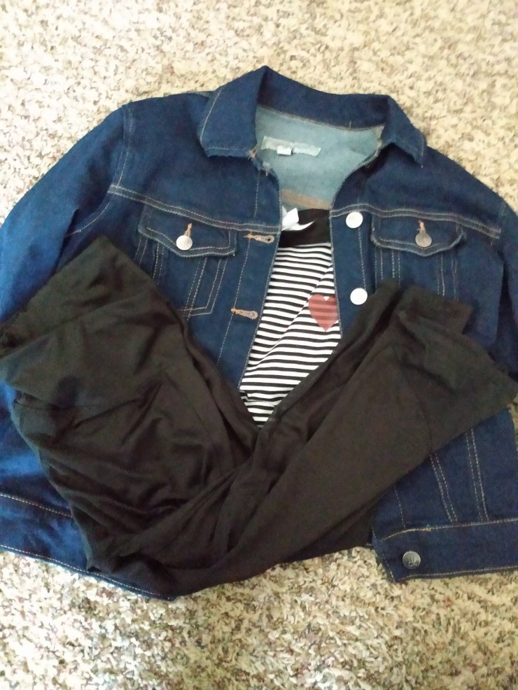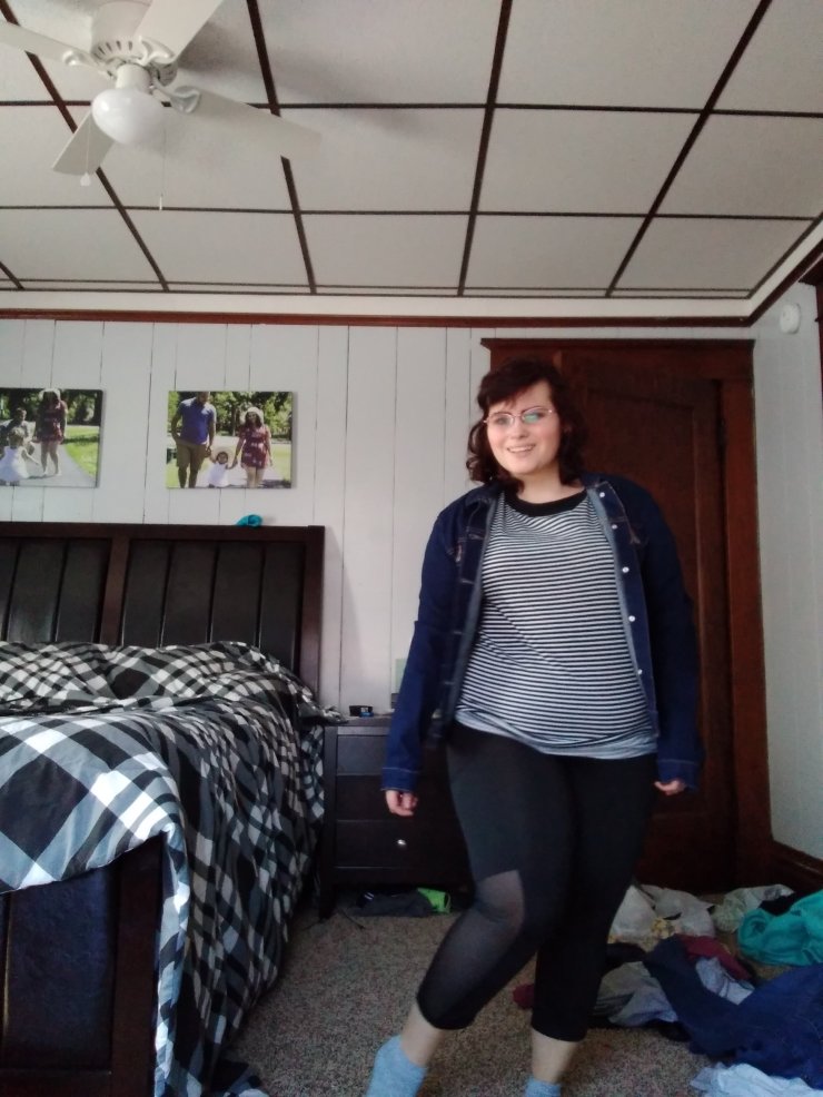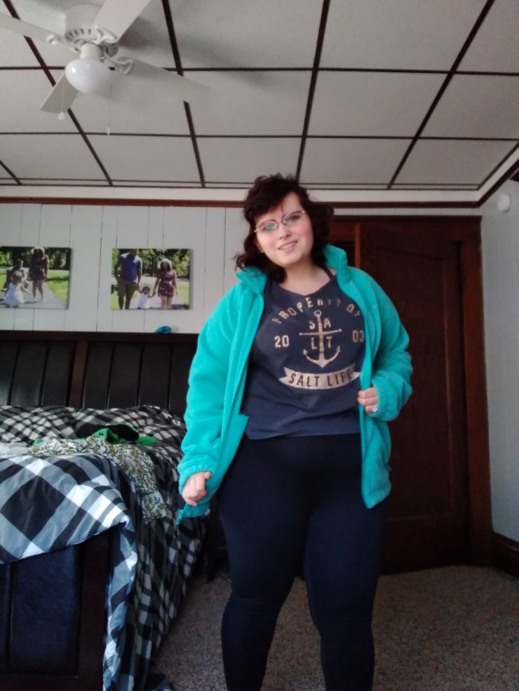 I love Capri leggings. I am four foot seven so I struggle with them actually fitting me right. I normally roll them up, but these leggings fit me perfectly. They are from Walmart. I need a new pair because these have a whole from me wearing them so often. The jacket is Calvin Klein and the top is lularoe.