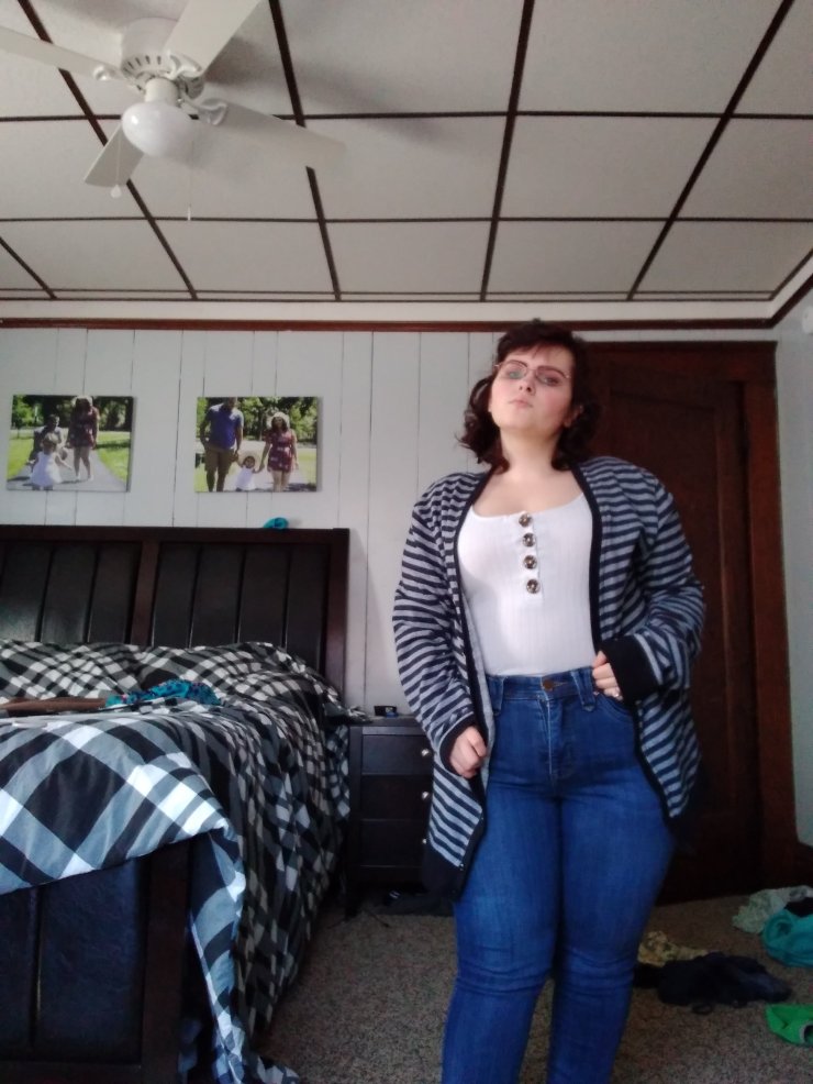 I love bodysuits. They are great layering pieces. This cardigan is super lightweight and comfortable. The cardigan is from a thrift store, the bodysuit is from @groopdealz, and the jeans are from seven7.
