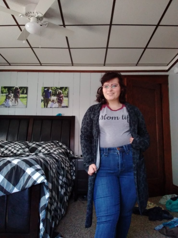 This cardigan is a head turner. I love how dramatic it is. I feel like it makes me look taller too. It is from Lularoe, the top I made online and the jeans are from seven7.