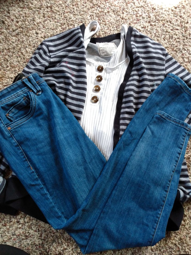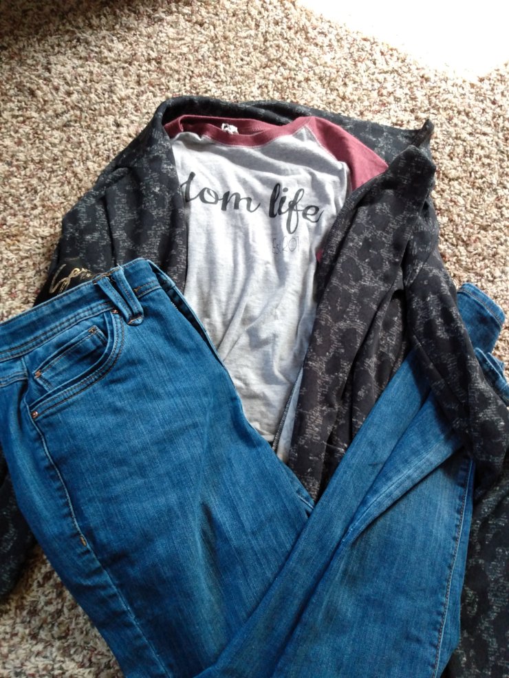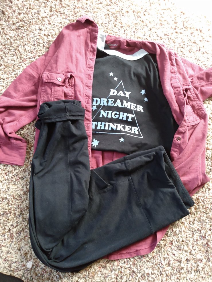 This is definitely a go to look for me. I wore this a ton last year. The button up is from Eddie Bauers, the top is lularoe, and the leggings are from Marshall’s.