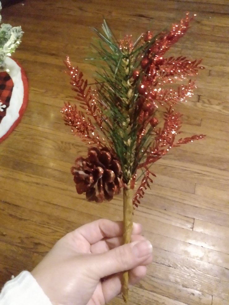 I then add some filler to the tree. I love pine cones because they are free and big. I just grab the ones outside for my tree.