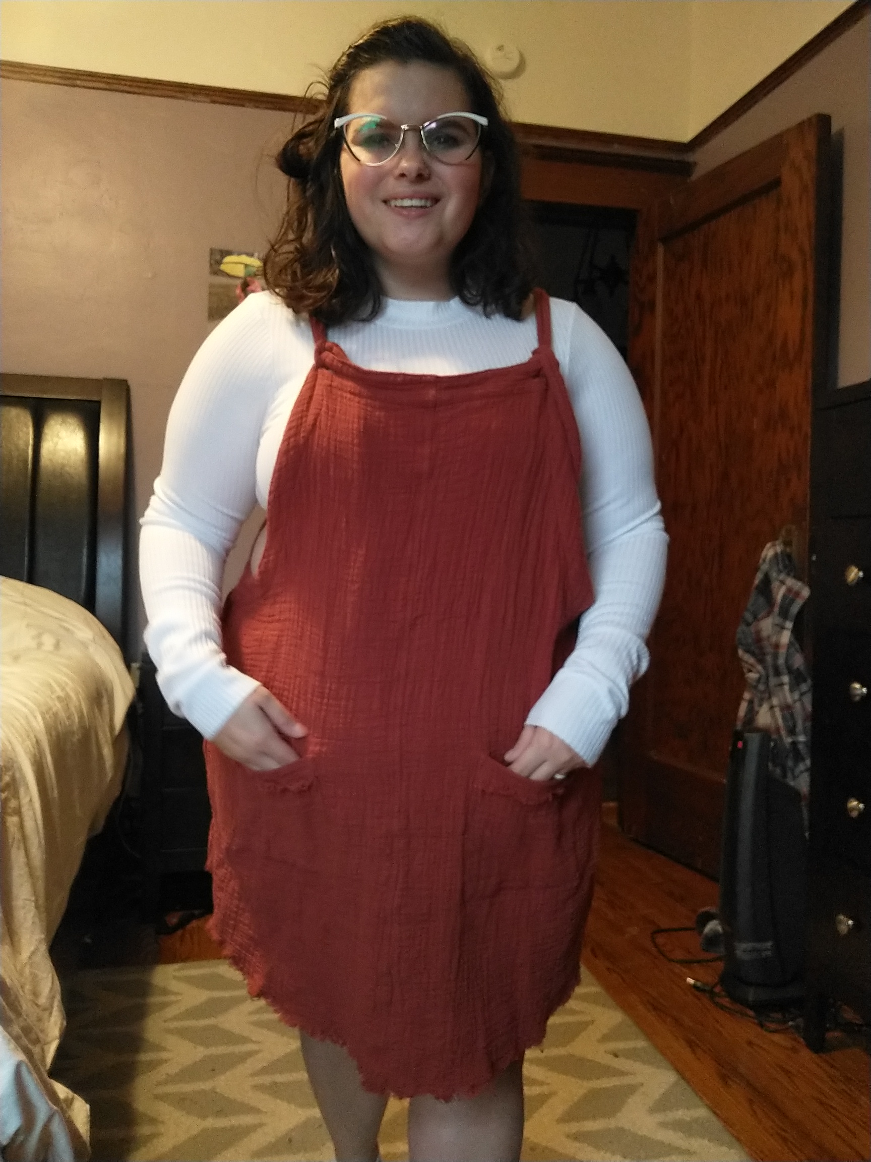 I absolutely love the color of this overall dress. It is so perfect for Thanksgiving. It is super comfortable and does not need shape wear with it. It makes me feel so feminine and confident in it.
