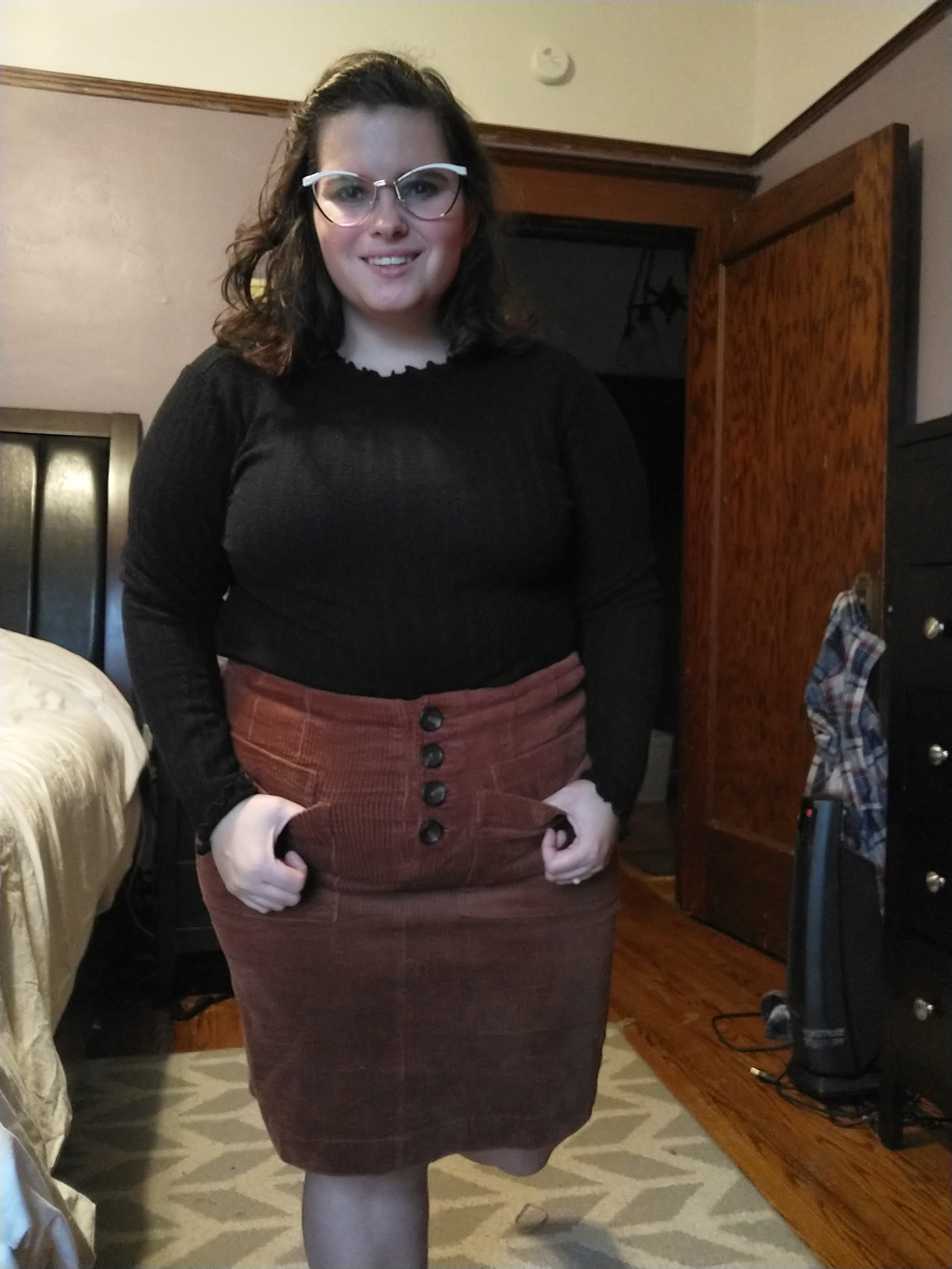 This is the outfit I’m most tempted to wear. A brown skirt is always a great idea. This one is warm and stretchy.